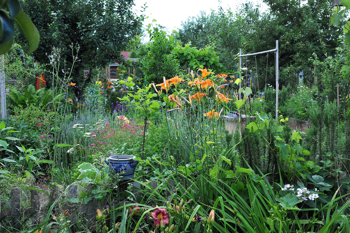 Auch finden Sie bei uns Beispiele zum Thema „urban gardening“, „vertikales Gärtnern“ oder zum Anlegen von Hochbeeten. Dazu blühen in der Saison über 150 Dahlienstöcke, ungefähr 70 Sorten Taglilien und natürlich jede Menge Rosen und andere Blumen.
