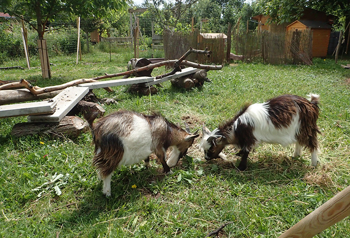 Die Landschaftspflege übernehmen unsere Zwergziegen. An sie verfüttern wir auch das Schnittgut, das beim wenigen Mähen unserer Rasenfläche anfällt (ihre geheime Leidenschaft scheinen aber Brombeerblätter zu sein). Für Insekten, Frösche und Eidechsen und was sonst noch in Hecken lebt, gibt es zwei Benjeshecken und jede Menge natürlicher Unterschlupfmöglichkeiten und Insektenhotels.