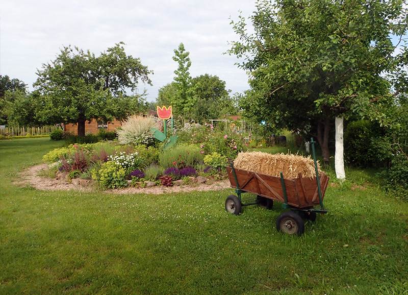 Über 40 Apfelbäume und Beerensträucher liefern eine feine Obstvielfalt. Und da wir den Anspruch haben, ein Umweltgarten zu sein, hat Wildobst wie Kornelkirsche, Mispel, Felsenbirne, Holunder oder Weißdorn bei uns einen festen Platz. Die Vögel danken es uns. Für sie haben wir an fast jedem Baum einen Nistkasten angebracht. Sie sind es auch, die dafür sorgen, dass im Garten das biologische Gleichgewicht gewahrt bleibt.